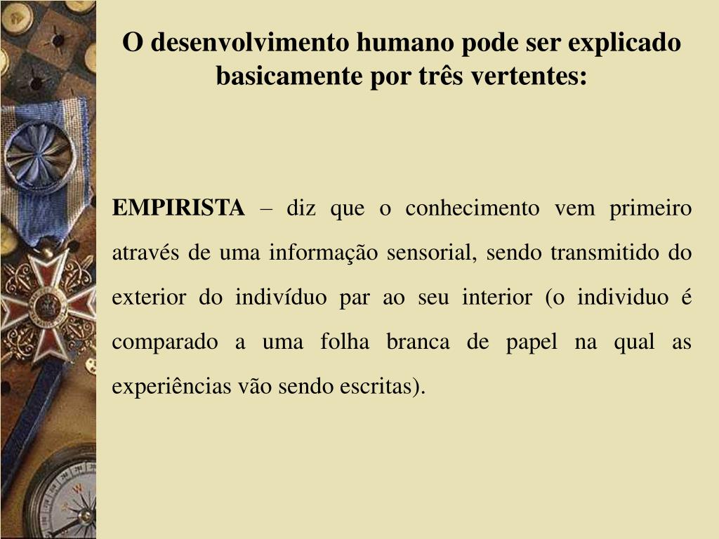 O desenvolvimento humano pode ser explicado basicamente por três vertentes: EMPIRISTA – diz que o conhecimento vem primeiro através de uma informação sensorial, sendo transmitido do exterior do indivíduo par ao seu interior (o individuo é comparado a uma folha branca de papel na qual as experiências vão sendo escritas).