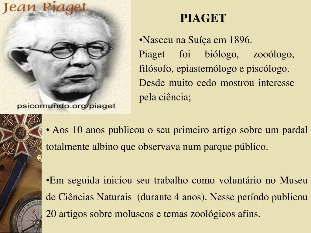 PIAGET • Nasceu na Suíça em 1896. • Piaget foi biólogo, zooólogo, filósofo, epiastemólogo e piscólogo. • Desde muito cedo mostrou interesse pela ciência; • Aos 10 anos publicou o seu primeiro artigo sobre um pardal totalmente albino que observava num parque público. • Em seguida iniciou seu trabalho como voluntário no Museu de Ciências Naturais (durante 4 anos). Nesse período publicou 20 artigos sobre moluscos e temas zoológicos afins.