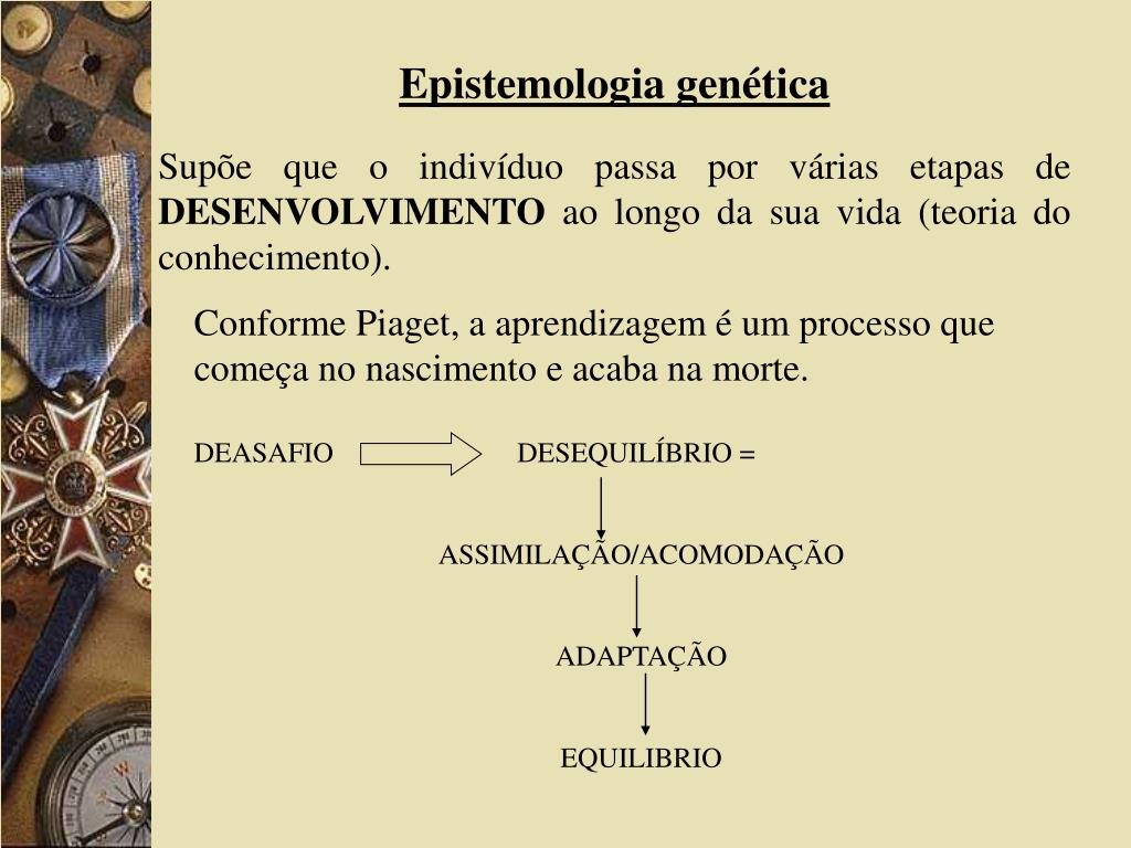 Epistemologia genética Supõe que o indivíduo passa por várias etapas de DESENVOLVIMENTO ao longo da sua vida (teoria do conhecimento). Conforme Piaget, a aprendizagem é um processo que começa no nascimento e acaba na morte. DEASAFIO DESEQUILÍBRIO = ASSIMILAÇÃO/ACOMODAÇÃO ADAPTAÇÃO EQUILIBRIO