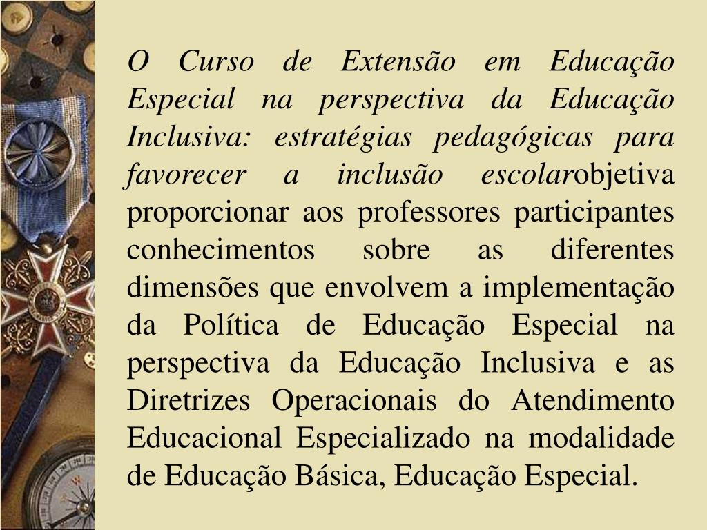 O Curso de Extensão em Educação Especial na perspectiva da Educação Inclusiva: estratégias pedagógicas para favorecer a inclusão escolarobjetiva proporcionar aos professores participantes conhecimentos sobre as diferentes dimensões que envolvem a implementação da Política de Educação Especial na perspectiva da Educação Inclusiva e as Diretrizes Operacionais do Atendimento Educacional Especializado na modalidade de Educação Básica, Educação Especial.