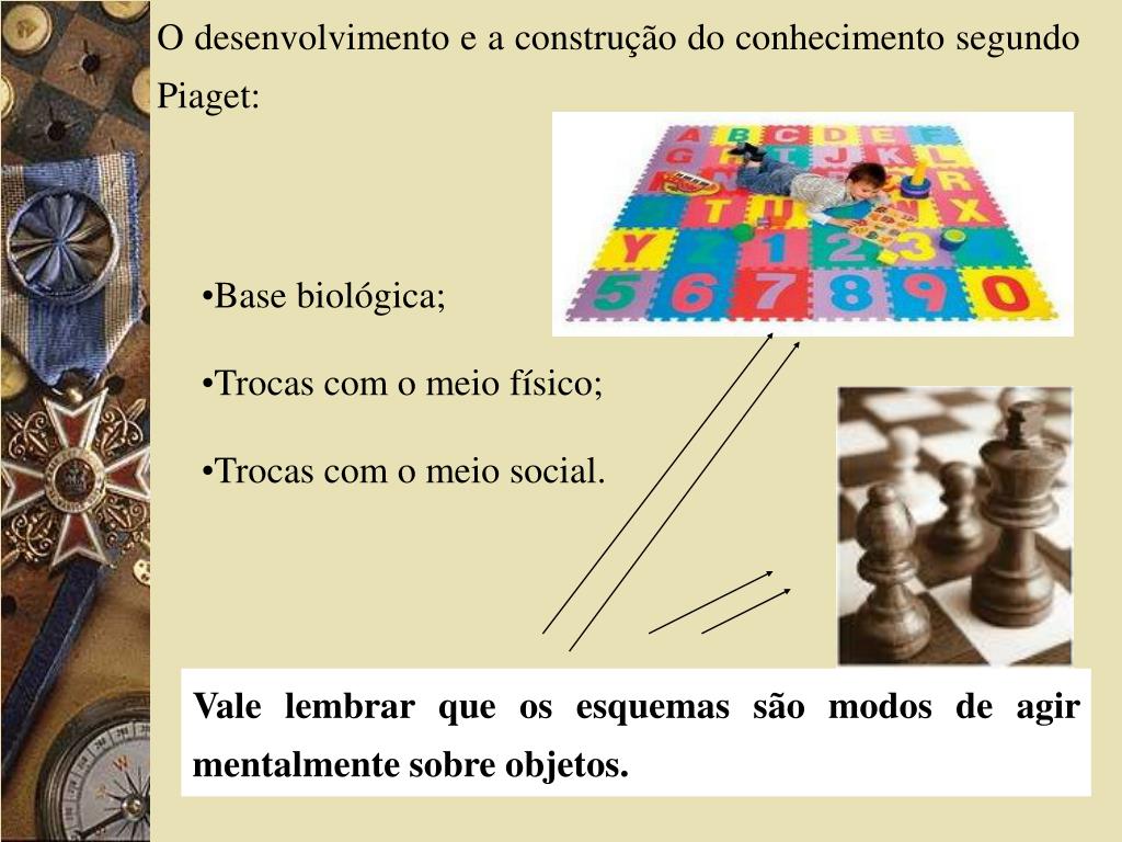 O desenvolvimento e a construção do conhecimento segundo Piaget: • Base biológica; • Trocas com o meio físico; • Trocas com o meio social. Vale lembrar que os esquemas são modos de agir mentalmente sobre objetos.