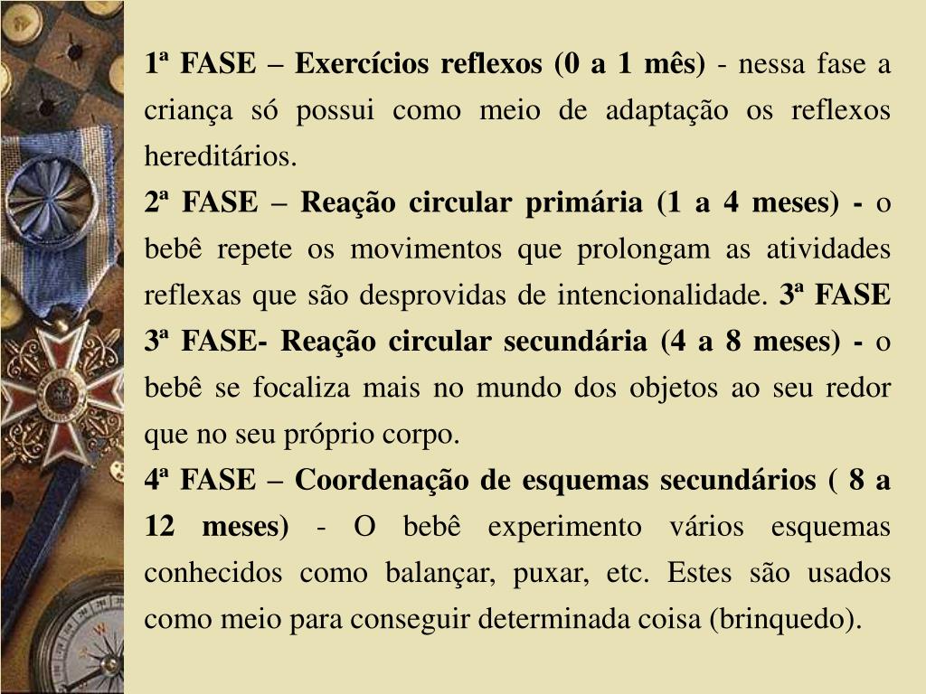 1ª FASE – Exercícios reflexos (0 a 1 mês) - nessa fase a criança só possui como meio de adaptação os reflexos hereditários. 2ª FASE – Reação circular primária (1 a 4 meses) - o bebê repete os movimentos que prolongam as atividades reflexas que são desprovidas de intencionalidade. 3ª FASE 3ª FASE- Reação circular secundária (4 a 8 meses) - o bebê se focaliza mais no mundo dos objetos ao seu redor que no seu próprio corpo. 4ª FASE – Coordenação de esquemas secundários ( 8 a 12 meses) - O bebê experimento vários esquemas conhecidos como balançar, puxar, etc. Estes são usados como meio para conseguir determinada coisa (brinquedo).