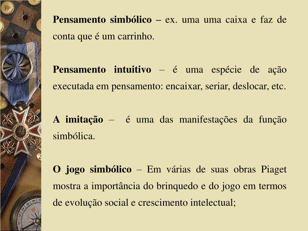 Pensamento simbólico – ex. uma uma caixa e faz de conta que é um carrinho. Pensamento intuitivo – é uma espécie de ação executada em pensamento: encaixar, seriar, deslocar, etc. A imitação – é uma das manifestações da função simbólica. O jogo simbólico – Em várias de suas obras Piaget mostra a importância do brinquedo e do jogo em termos de evolução social e crescimento intelectual;