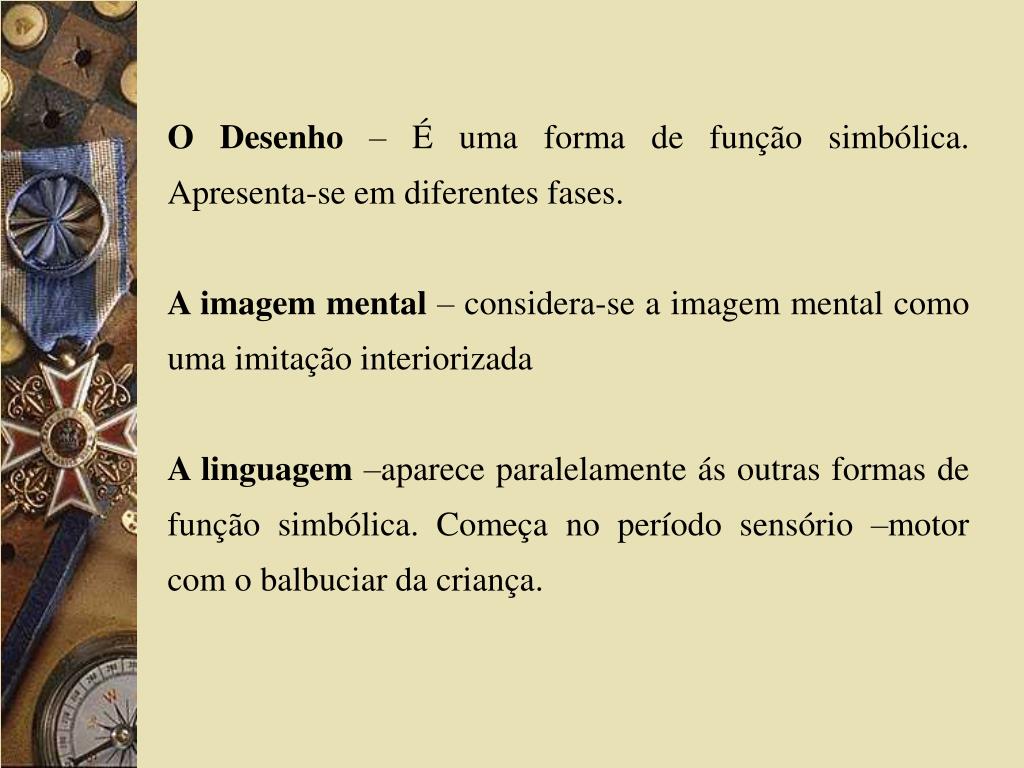 O Desenho – É uma forma de função simbólica. Apresenta-se em diferentes fases. A imagem mental – considera-se a imagem mental como uma imitação interiorizada A linguagem –aparece paralelamente ás outras formas de função simbólica. Começa no período sensório –motor com o balbuciar da criança.