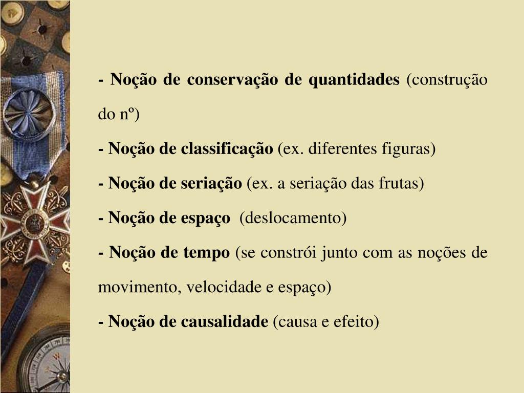- Noção de conservação de quantidades (construção do nº) - Noção de classificação (ex. diferentes figuras) - Noção de seriação (ex. a seriação das frutas) - Noção de espaço (deslocamento) - Noção de tempo (se constrói junto com as noções de movimento, velocidade e espaço) - Noção de causalidade (causa e efeito)