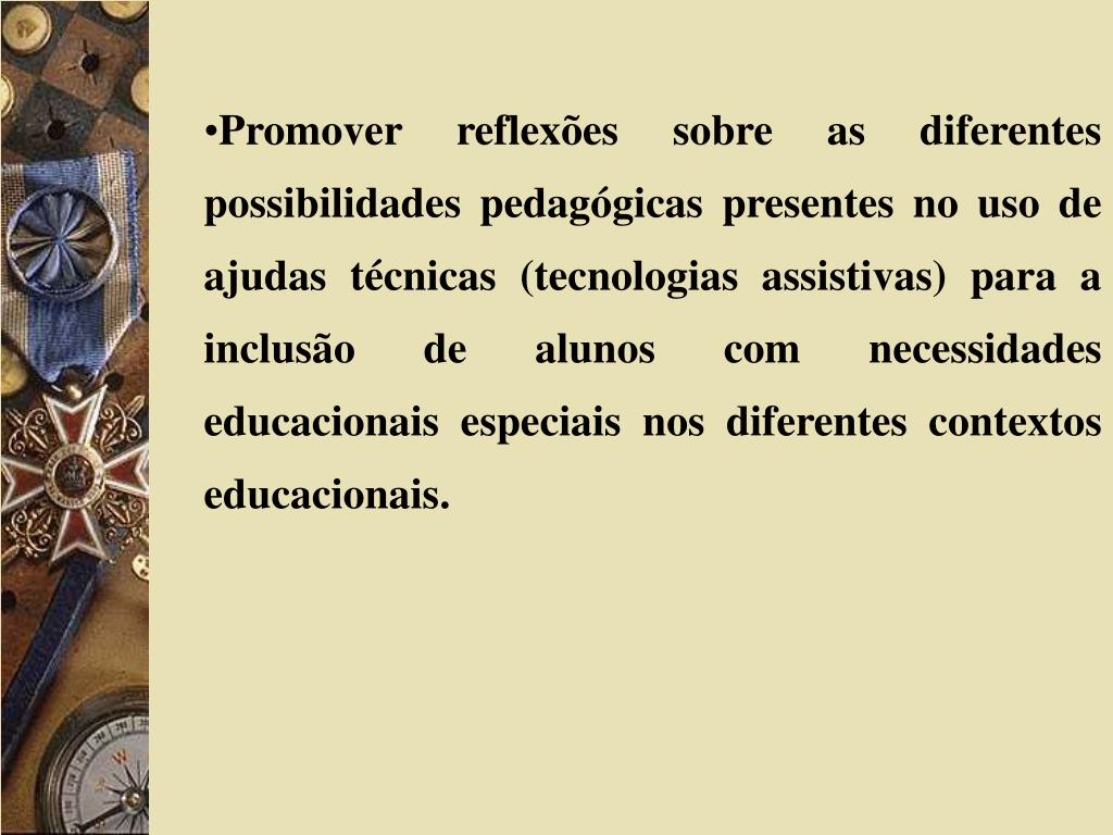 Promover reflexões sobre as diferentes possibilidades pedagógicas presentes no uso de ajudas técnicas (tecnologias assistivas) para a inclusão de alunos com necessidades educacionais especiais nos diferentes contextos educacionais.