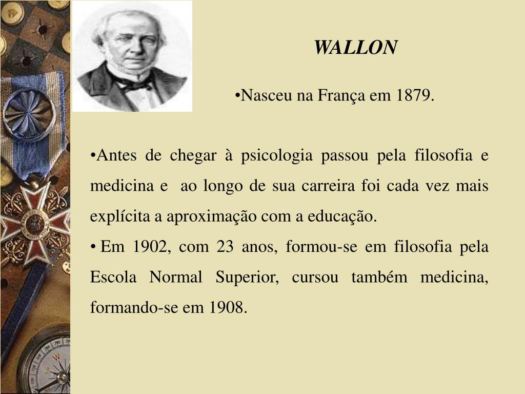 WALLON • Nasceu na França em 1879. • Antes de chegar à psicologia passou pela filosofia e medicina e ao longo de sua carreira foi cada vez mais explícita a aproximação com a educação. • Em 1902, com 23 anos, formou-se em filosofia pela Escola Normal Superior, cursou também medicina, formando-se em 1908.