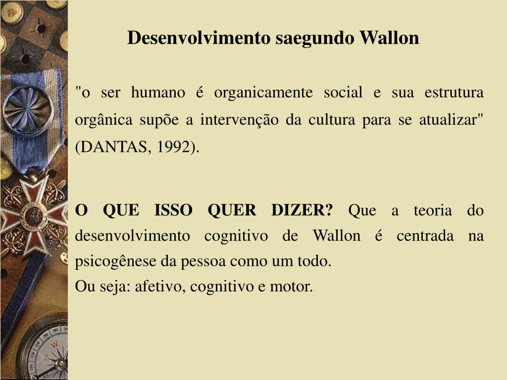 Desenvolvimento saegundo Wallon "o ser humano é organicamente social e sua estrutura orgânica supõe a intervenção da cultura para se atualizar" (DANTAS, 1992). O QUE ISSO QUER DIZER? Que a teoria do desenvolvimento cognitivo de Wallon é centrada na psicogênese da pessoa como um todo. Ou seja: afetivo, cognitivo e motor.