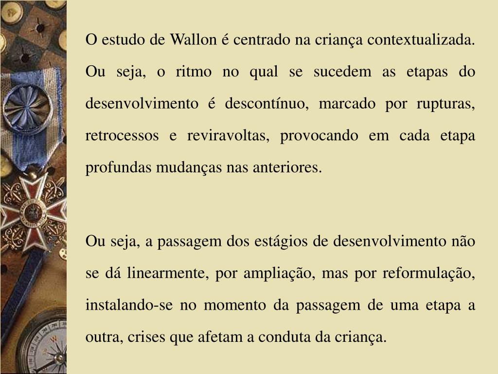 O estudo de Wallon é centrado na criança contextualizada. Ou seja, o ritmo no qual se sucedem as etapas do desenvolvimento é descontínuo, marcado por rupturas, retrocessos e reviravoltas, provocando em cada etapa profundas mudanças nas anteriores. Ou seja, a passagem dos estágios de desenvolvimento não se dá linearmente, por ampliação, mas por reformulação, instalando-se no momento da passagem de uma etapa a outra, crises que afetam a conduta da criança.