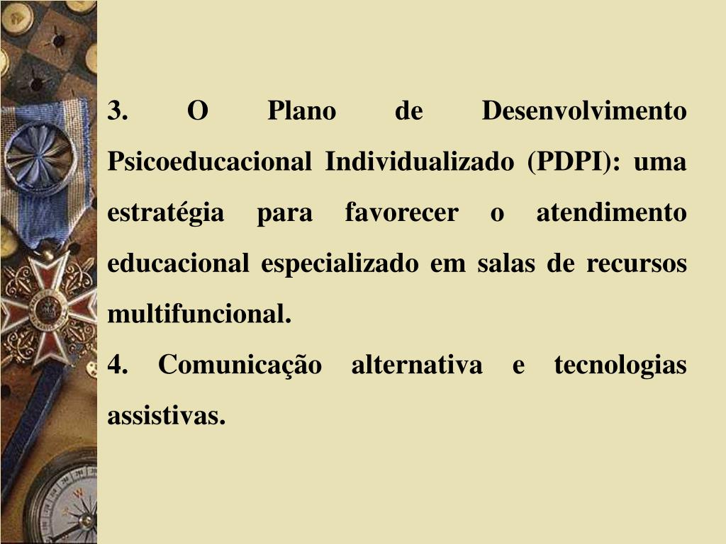 3. O Plano de Desenvolvimento Psicoeducacional Individualizado (PDPI): uma estratégia para favorecer o atendimento educacional especializado em salas de recursos multifuncional. 4. Comunicação alternativa e tecnologias assistivas.