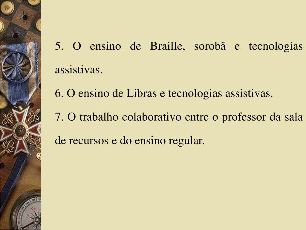 5. O ensino de Braille, sorobã e tecnologias assistivas. 6. O ensino de Libras e tecnologias assistivas. 7. O trabalho colaborativo entre o professor da sala de recursos e do ensino regular.