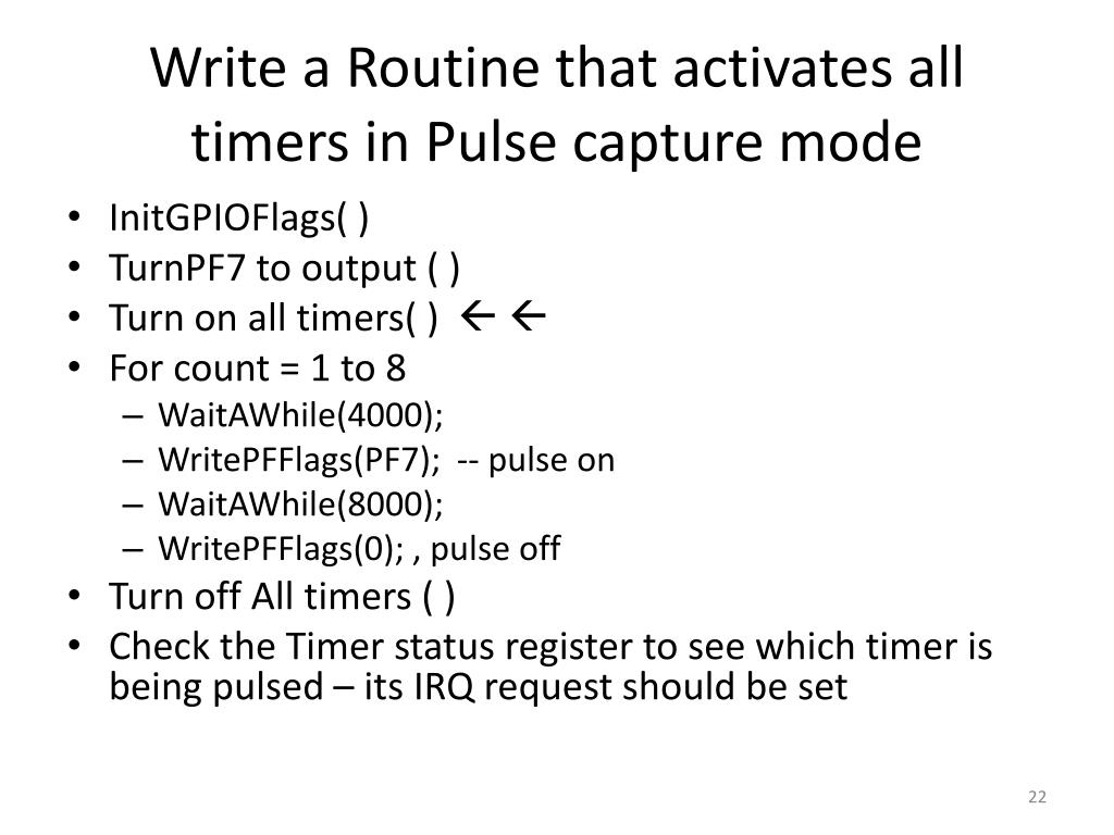 Write a Routine that activates all timers in Pulse capture mode • InitGPIOFlags( ) • TurnPF7 to output ( ) • Turn on all timers( ) • For count = 1 to 8 • WaitAWhile(4000); • WritePFFlags(PF7); -- pulse on • WaitAWhile(8000); • WritePFFlags(0); , pulse off • Turn off All timers ( ) • Check the Timer status register to see which timer is being pulsed – its IRQ request should be set