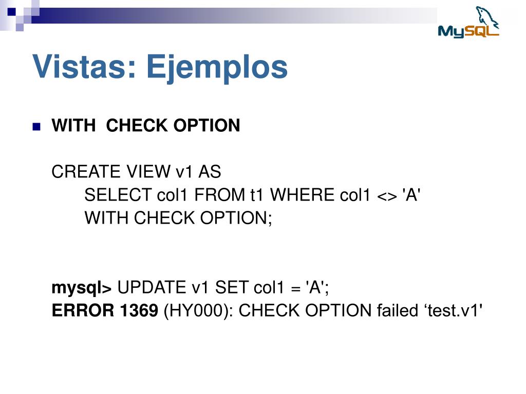 Vistas: Ejemplos • WITH CHECK OPTION CREATE VIEW v1 AS SELECT col1 FROM t1 WHERE col1 <> 'A' WITH CHECK OPTION; mysql> UPDATE v1 SET col1 = 'A'; ERROR 1369 (HY000): CHECK OPTION failed ‘test.v1'
