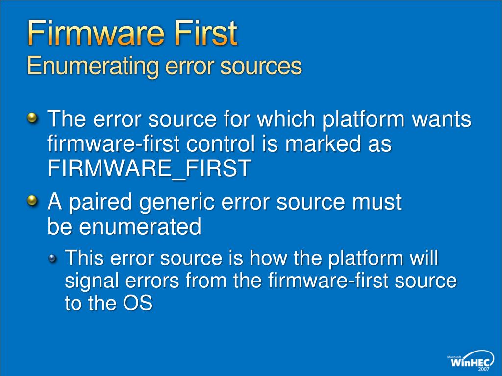 Firmware FirstEnumerating error sources • The error source for which platform wants firmware-first control is marked as FIRMWARE_FIRST • A paired generic error source must be enumerated • This error source is how the platform will signal errors from the firmware-first source to the OS