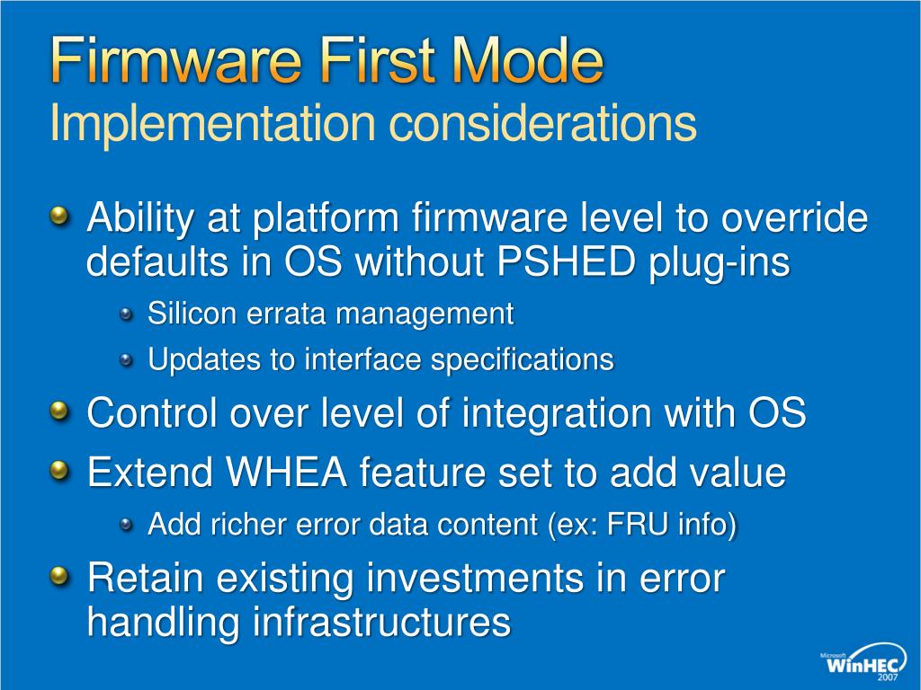 Firmware First ModeImplementation considerations • Ability at platform firmware level to override defaults in OS without PSHED plug-ins • Silicon errata management • Updates to interface specifications • Control over level of integration with OS • Extend WHEA feature set to add value • Add richer error data content (ex: FRU info) • Retain existing investments in error handling infrastructures