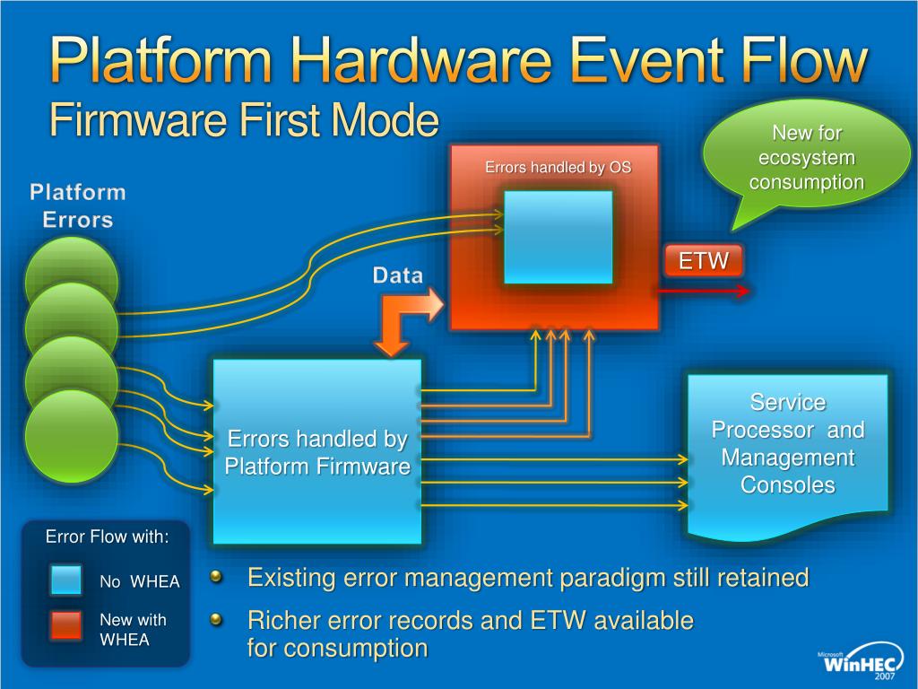 Platform Hardware Event FlowFirmware First Mode New for ecosystem consumption • Errors handled by OS Platform Errors ETW Data Errors handled by Platform Firmware Service Processor and Management Consoles Error Flow with: • Existing error management paradigm still retained • Richer error records and ETW available for consumption No WHEA New with WHEA