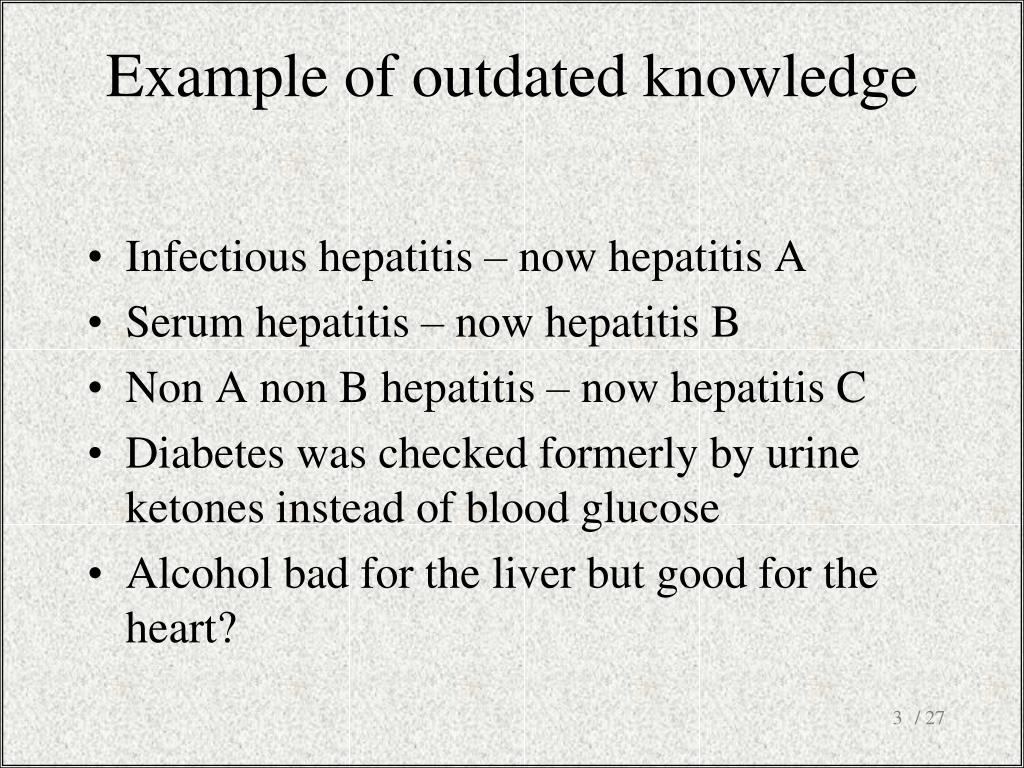 Example of outdated knowledge • Infectious hepatitis – now hepatitis A • Serum hepatitis – now hepatitis B • Non A non B hepatitis – now hepatitis C • Diabetes was checked formerly by urine ketones instead of blood glucose • Alcohol bad for the liver but good for the heart? / 27