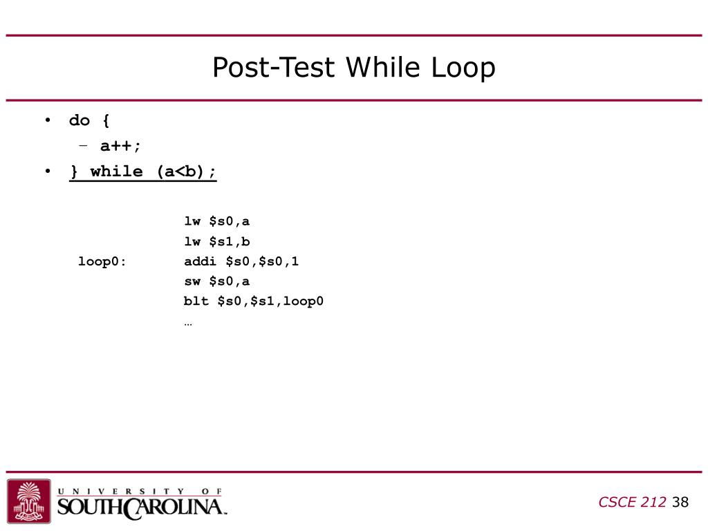 Post-Test While Loop • do { • a++; • } while (a<b); lw $s0,a lw $s1,b loop0: addi $s0,$s0,1 sw $s0,a blt $s0,$s1,loop0 …