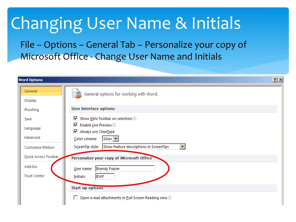 Changing User Name & Initials File – Options – General Tab – Personalize your copy of Microsoft Office - Change User Name and Initials