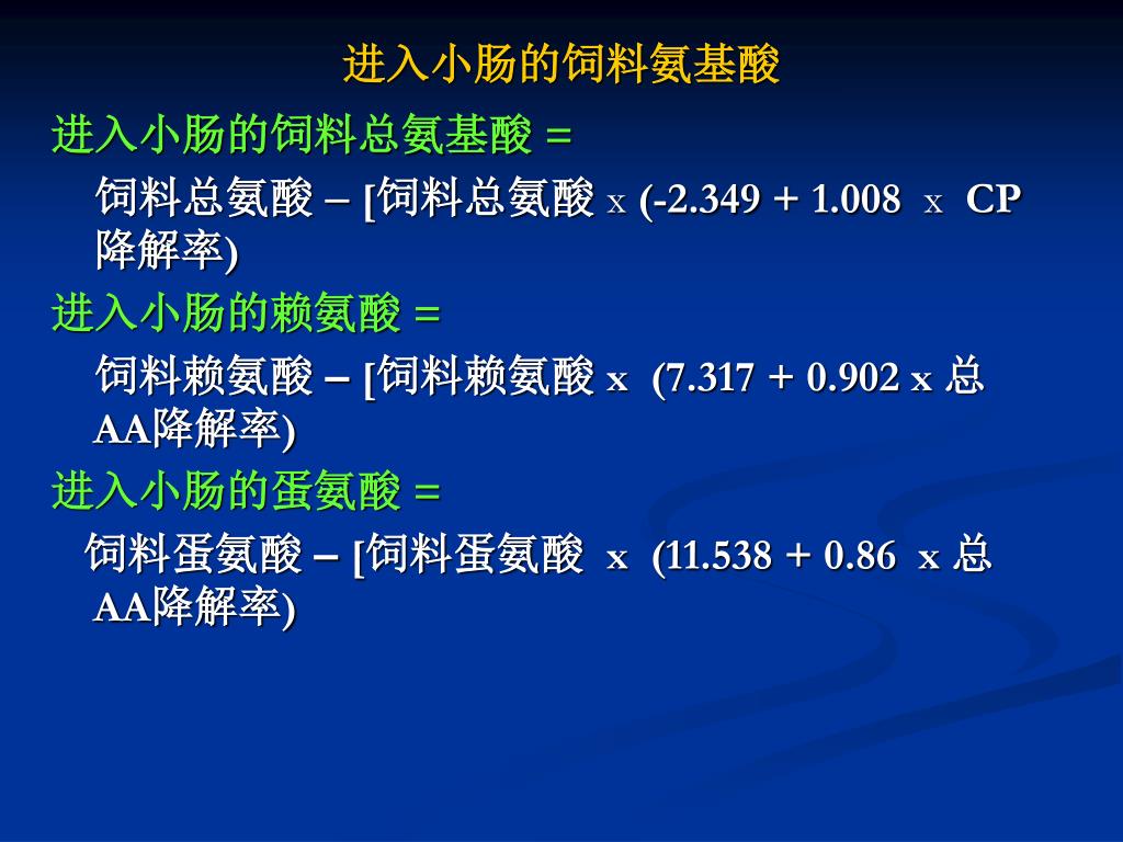 进入小肠的饲料氨基酸 进入小肠的饲料总氨基酸= 饲料总氨酸–[饲料总氨酸x (-2.349+1.008 x CP降解率) 进入小肠的赖氨酸= 饲料赖氨酸 – [饲料赖氨酸 x (7.317 + 0.902 x 总AA降解率) 进入小肠的蛋氨酸 = 饲料蛋氨酸 – [饲料蛋氨酸 x (11.538 + 0.86 x 总AA降解率)