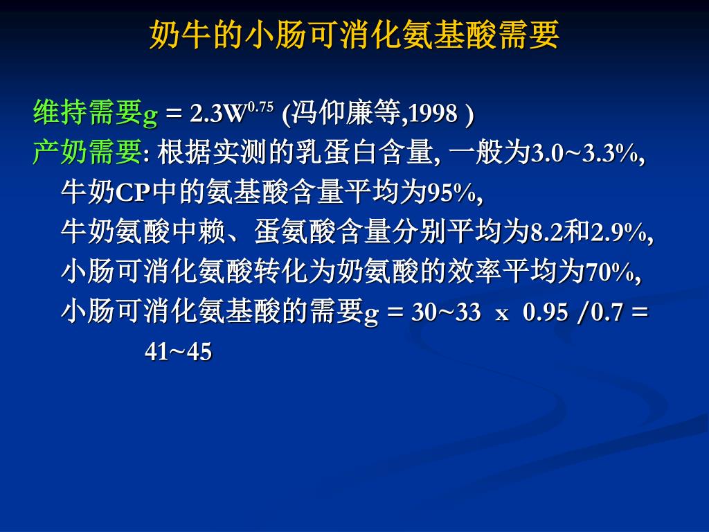 奶牛的小肠可消化氨基酸需要 维持需要g = 2.3W0.75 (冯仰廉等,1998 ) 产奶需要: 根据实测的乳蛋白含量, 一般为3.0~3.3%, 牛奶CP中的氨基酸含量平均为95%, 牛奶氨酸中赖、蛋氨酸含量分别平均为8.2和2.9%, 小肠可消化氨酸转化为奶氨酸的效率平均为70%, 小肠可消化氨基酸的需要g = 30~33 x 0.95 /0.7 = 41~45