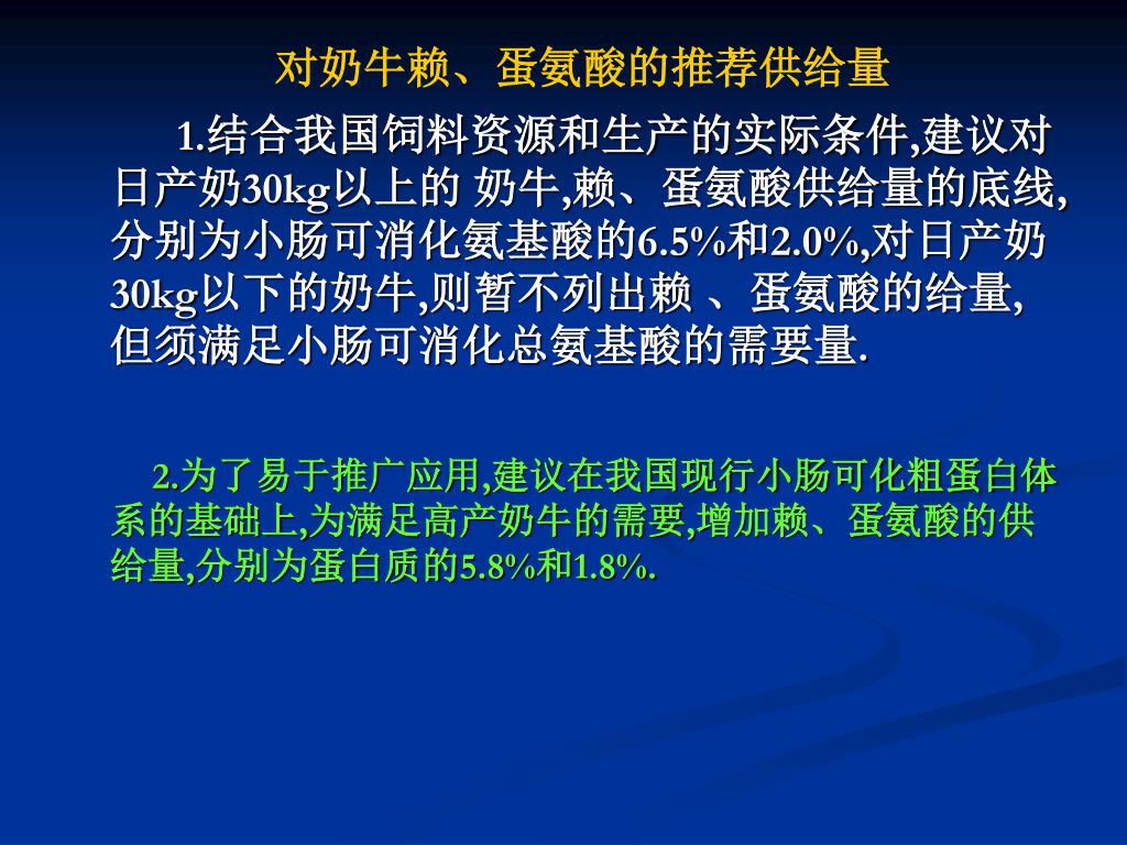对奶牛赖、蛋氨酸的推荐供给量 1.结合我国饲料资源和生产的实际条件,建议对日产奶30kg以上的 奶牛,赖、蛋氨酸供给量的底线,分别为小肠可消化氨基酸的6.5%和2.0%,对日产奶30kg以下的奶牛,则暂不列出赖 、蛋氨酸的给量,但须满足小肠可消化总氨基酸的需要量. 2.为了易于推广应用,建议在我国现行小肠可化粗蛋白体系的基础上,为满足高产奶牛的需要,增加赖、蛋氨酸的供给量,分别为蛋白质的5.8%和1.8%.