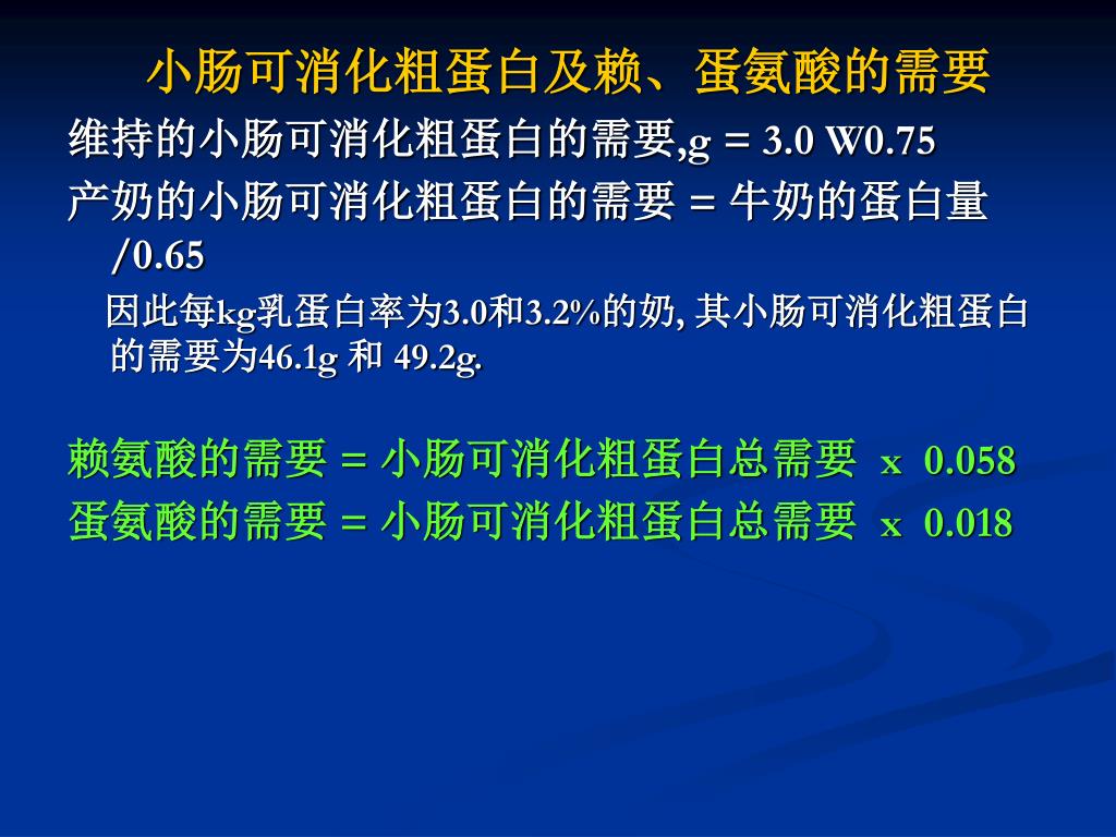 小肠可消化粗蛋白及赖、蛋氨酸的需要 维持的小肠可消化粗蛋白的需要,g = 3.0 W0.75 产奶的小肠可消化粗蛋白的需要 = 牛奶的蛋白量 /0.65 因此每kg乳蛋白率为3.0和3.2%的奶, 其小肠可消化粗蛋白的需要为46.1g 和 49.2g. 赖氨酸的需要 = 小肠可消化粗蛋白总需要 x 0.058 蛋氨酸的需要 = 小肠可消化粗蛋白总需要 x 0.018