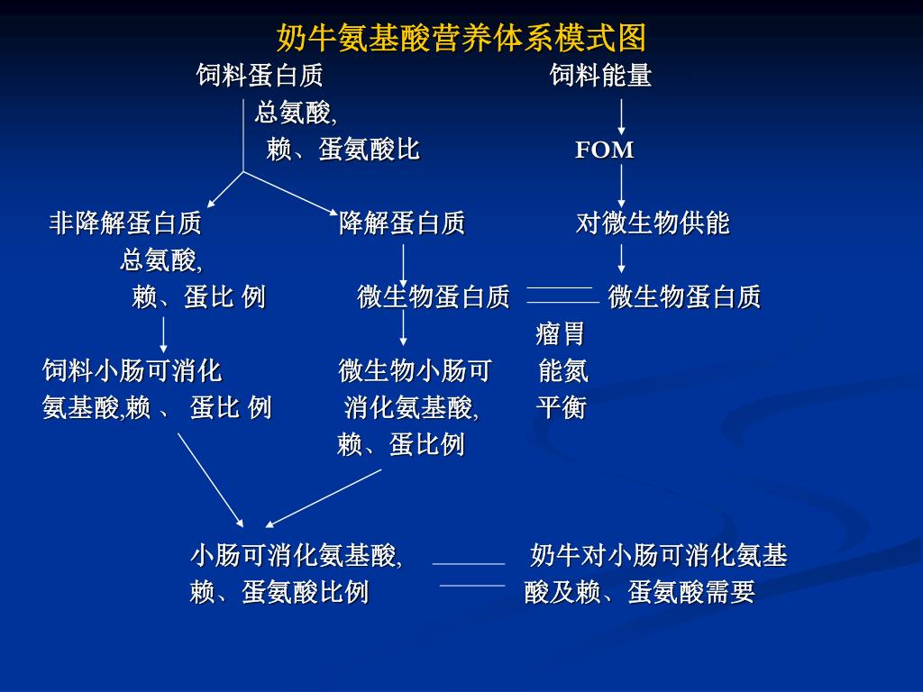 奶牛氨基酸营养体系模式图 饲料蛋白质饲料能量 总氨酸, 赖、蛋氨酸比FOM 非降解蛋白质降解蛋白质对微生物供能 总氨酸, 赖、蛋比例微生物蛋白质微生物蛋白质 瘤胃 饲料小肠可消化微生物小肠可能氮 氨基酸,赖 、 蛋比例消化氨基酸, 平衡 赖、蛋比例 小肠可消化氨基酸, 奶牛对小肠可消化氨基 赖、蛋氨酸比例酸及赖、蛋氨酸需要