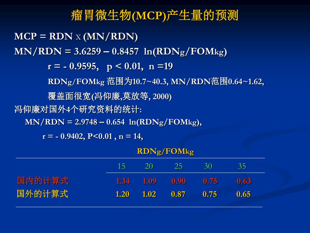 瘤胃微生物(MCP)产生量的预测 MCP = RDN X (MN/RDN) MN/RDN = 3.6259 – 0.8457 ln(RDNg/FOMkg) r = - 0.9595, p < 0.01, n =19 RDNg/FOMkg 范围为10.7~40.3, MN/RDN范围0.64~1.62, 覆盖面很宽(冯仰廉,莫放等, 2000) 冯仰廉对国外4个研究资料的统计: MN/RDN = 2.9748 – 0.654 ln(RDNg/FOMkg), r = - 0.9402, P<0.01 , n = 14, RDNg/FOMkg 15 20 25 30 35 国内的计算式 1.34 1.09 0.90 0.75 0.63 国外的计算式 1.20 1.02 0.87 0.75 0.65