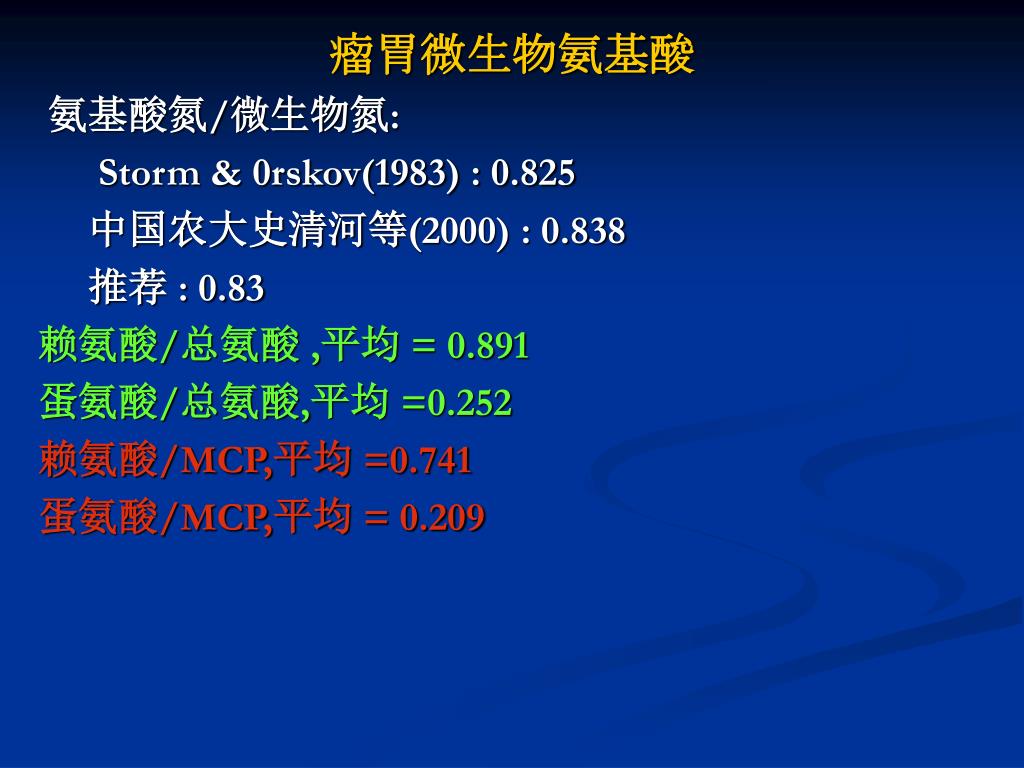 瘤胃微生物氨基酸 氨基酸氮/微生物氮: Storm & 0rskov(1983) : 0.825 中国农大史清河等(2000) : 0.838 推荐 : 0.83 赖氨酸/总氨酸 ,平均 = 0.891 蛋氨酸/总氨酸,平均 =0.252 赖氨酸/MCP,平均 =0.741 蛋氨酸/MCP,平均 = 0.209
