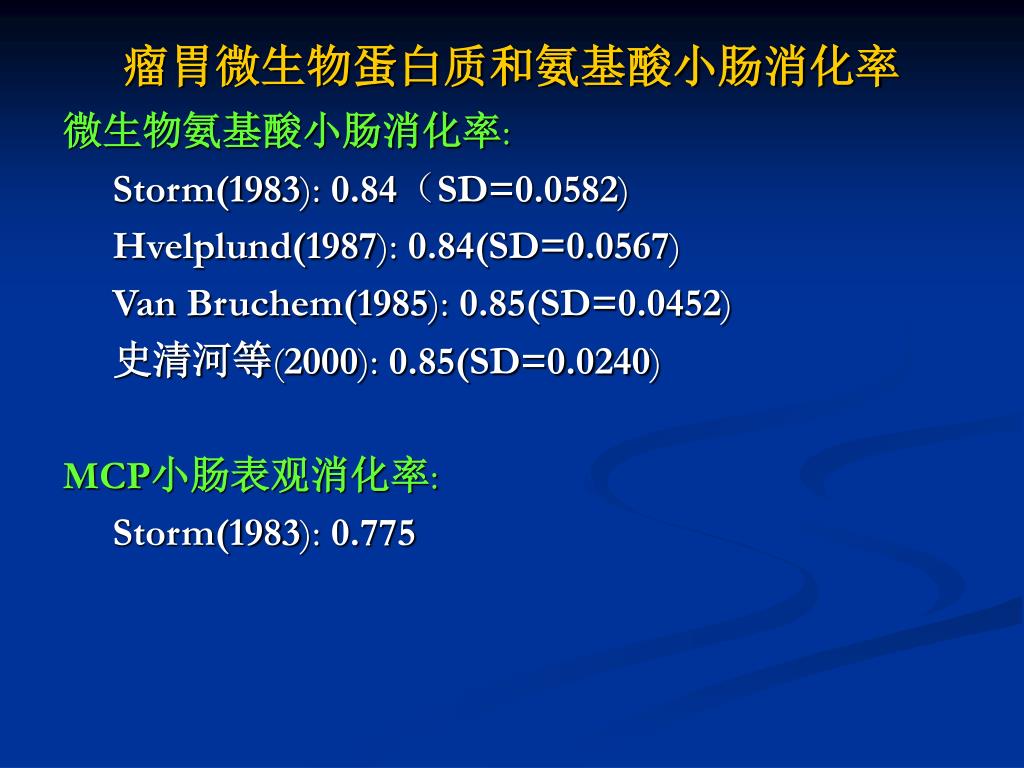 瘤胃微生物蛋白质和氨基酸小肠消化率 微生物氨基酸小肠消化率: Storm(1983): 0.84(SD=0.0582) Hvelplund(1987): 0.84(SD=0.0567) VanBruchem(1985): 0.85(SD=0.0452) 史清河等(2000): 0.85(SD=0.0240) MCP小肠表观消化率: Storm(1983): 0.775