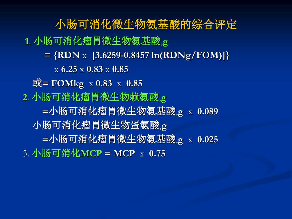 小肠可消化微生物氨基酸的综合评定 1. 小肠可消化瘤胃微生物氨基酸,g ={RDN x [3.6259-0.8457ln(RDNg/FOM)]} x 6.25 x 0.83 x 0.85 或=FOMkg x 0.83 x 0.85 2. 小肠可消化瘤胃微生物赖氨酸,g =小肠可消化瘤胃微生物氨基酸,g x 0.089 小肠可消化瘤胃微生物蛋氨酸,g =小肠可消化瘤胃微生物氨基酸,g x 0.025 3. 小肠可消化MCP=MCP x 0.75