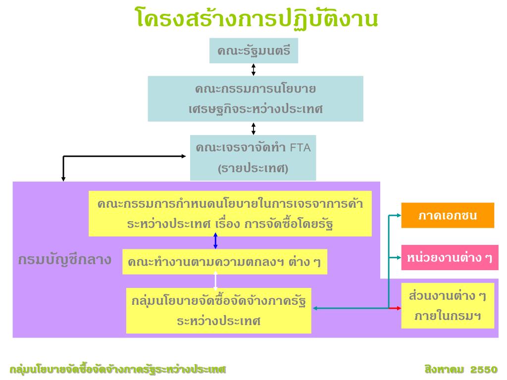 โครงสร้างการปฏิบัติงานโครงสร้างการปฏิบัติงาน คณะรัฐมนตรี คณะกรรมการนโยบาย เศรษฐกิจระหว่างประเทศ คณะเจรจาจัดทำ FTA (รายประเทศ) คณะกรรมการกำหนดนโยบายในการเจรจาการค้า ระหว่างประเทศ เรื่อง การจัดซื้อโดยรัฐ ภาคเอกชน กรมบัญชีกลาง หน่วยงานต่างๆ คณะทำงานตามความตกลงฯ ต่างๆ ส่วนงานต่างๆ ภายในกรมฯ กลุ่มนโยบายจัดซื้อจัดจ้างภาครัฐ ระหว่างประเทศ กลุ่มนโยบายจัดซื้อจัดจ้างภาครัฐระหว่างประเทศ สิงหาคม 2550