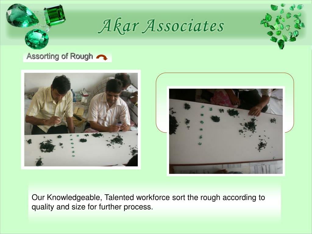 Manufacturing Facility Akar Associates is an established leader in sourcing and manufacturing high quality, colored Emerald gemstones since 1978. We have fully integrated manufacturing process from rough gems to finished Emerald cutstone in all shapes and sizes all under one roof. The manufacturing infrastructure is most modern, and compares with the best anywhere in the world.