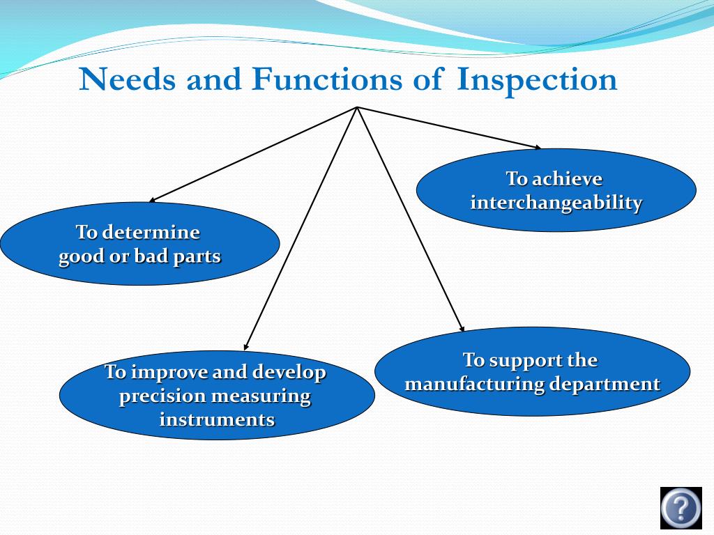 Needs and Functions of Inspection To achieve interchangeability To determine good or bad parts To support the manufacturing department To improve and develop precision measuring instruments