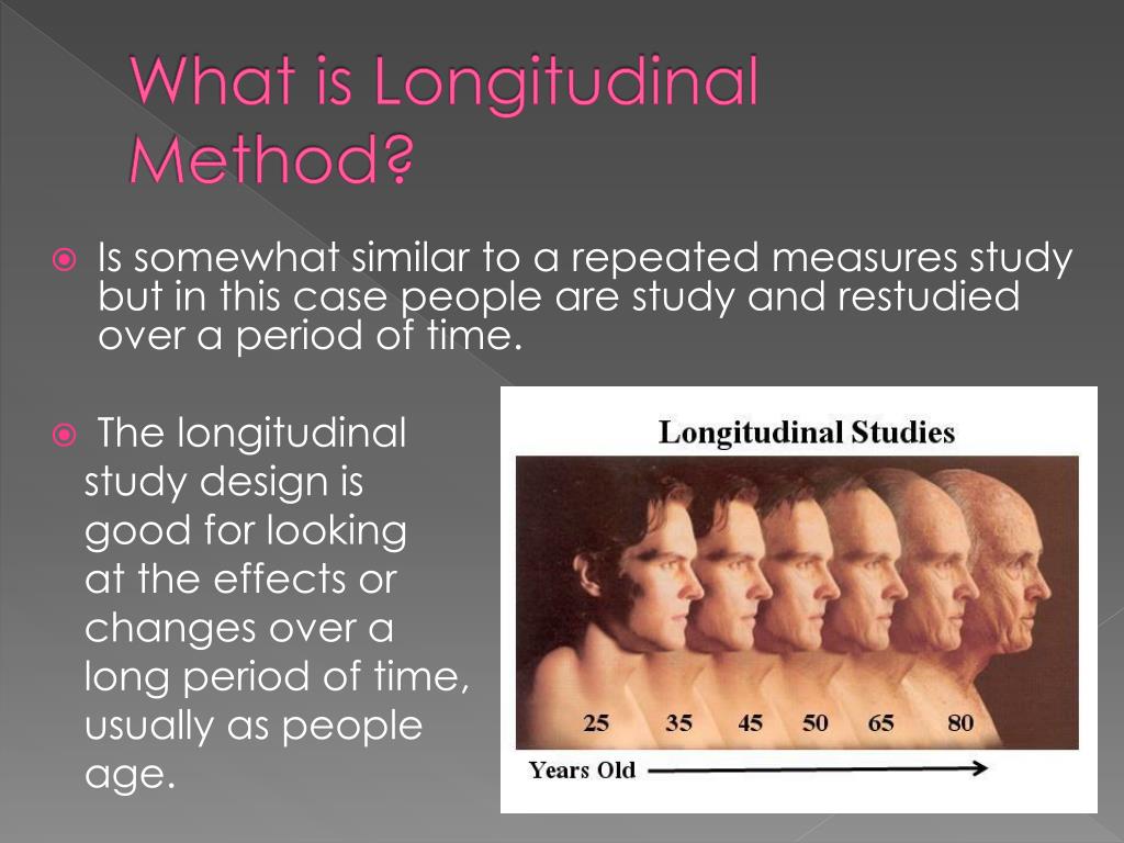 What is Longitudinal Method? • Is somewhat similar to a repeated measures study but in this case people are study and restudied over a period of time. • The longitudinal study design is good for looking at the effects or changes over a long period of time, usually as people age.