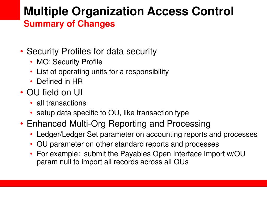 Multiple Organization Access ControlSummary of Changes • Security Profiles for data security • MO: Security Profile • List of operating units for a responsibility • Defined in HR • OU field on UI • all transactions • setup data specific to OU, like transaction type • Enhanced Multi-Org Reporting and Processing • Ledger/Ledger Set parameter on accounting reports and processes • OU parameter on other standard reports and processes • For example: submit the Payables Open Interface Import w/OU param null to import all records across all OUs