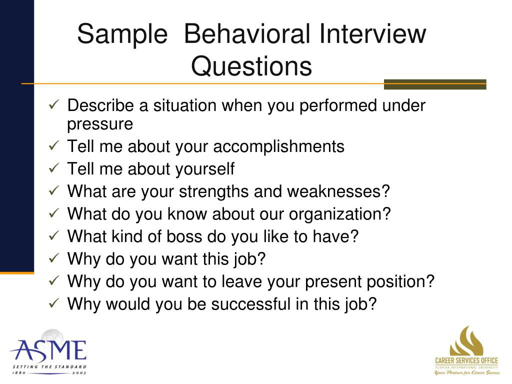 Sample Behavioral Interview Questions • Describe a situation when you performed under pressure • Tell me about your accomplishments • Tell me about yourself • What are your strengths and weaknesses? • What do you know about our organization? • What kind of boss do you like to have? • Why do you want this job? • Why do you want to leave your present position? • Why would you be successful in this job?
