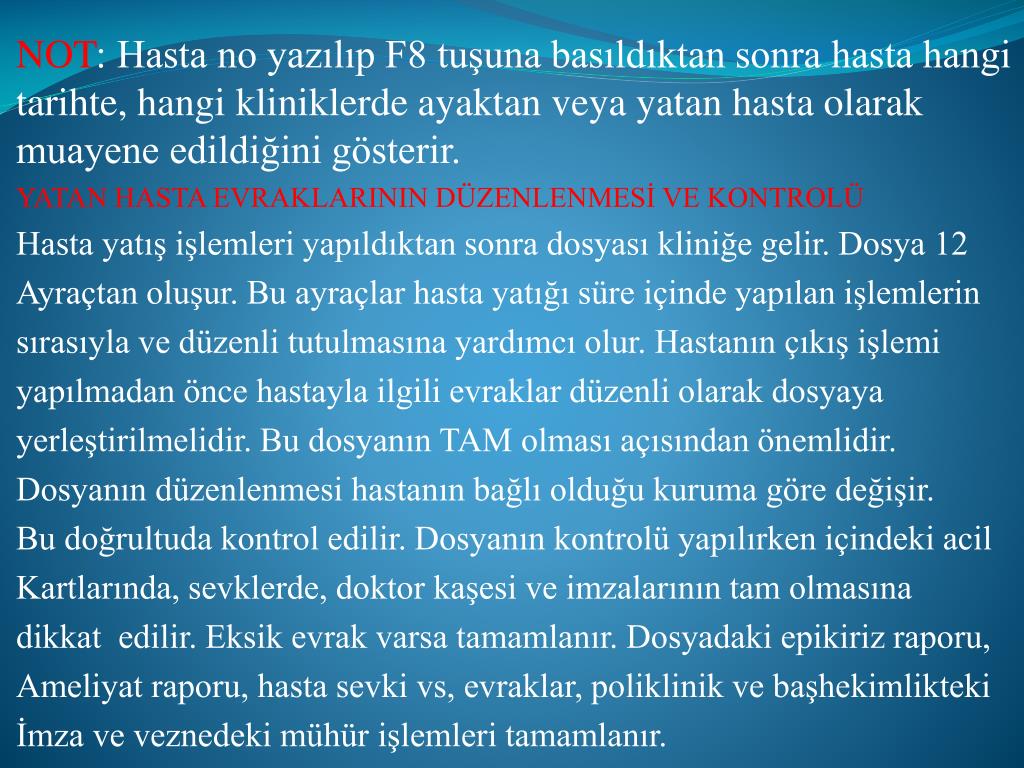 NOT: Hasta no yazılıp F8 tuşuna basıldıktan sonra hasta hangi tarihte, hangi kliniklerde ayaktan veya yatan hasta olarak muayene edildiğini gösterir. YATAN HASTA EVRAKLARININ DÜZENLENMESİ VE KONTROLÜ Hasta yatış işlemleri yapıldıktan sonra dosyası kliniğe gelir. Dosya 12 Ayraçtan oluşur. Bu ayraçlar hasta yatığı süre içinde yapılan işlemlerin sırasıyla ve düzenli tutulmasına yardımcı olur. Hastanın çıkış işlemi yapılmadan önce hastayla ilgili evraklar düzenli olarak dosyaya yerleştirilmelidir. Bu dosyanın TAM olması açısından önemlidir. Dosyanın düzenlenmesi hastanın bağlı olduğu kuruma göre değişir. Bu doğrultuda kontrol edilir. Dosyanın kontrolü yapılırken içindeki acil Kartlarında, sevklerde, doktor kaşesi ve imzalarının tam olmasına dikkat edilir. Eksik evrak varsa tamamlanır. Dosyadaki epikiriz raporu, Ameliyat raporu, hasta sevki vs, evraklar, poliklinik ve başhekimlikteki İmza ve veznedeki mühür işlemleri tamamlanır.