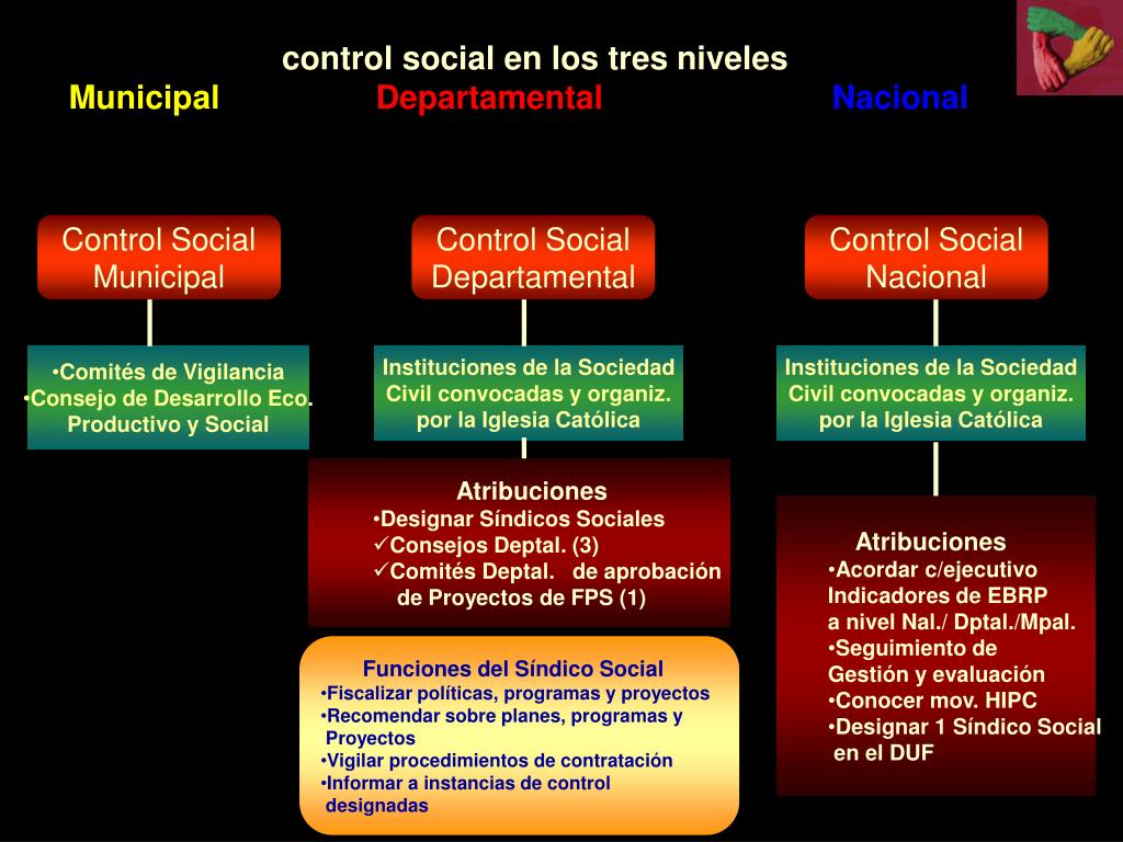 control social en los tres niveles Municipal Departamental Nacional Control Social Municipal Control Social Departamental Control Social Nacional • Comités de Vigilancia • Consejo de Desarrollo Eco. • Productivo y Social Instituciones de la Sociedad Civil convocadas y organiz. por la Iglesia Católica Instituciones de la Sociedad Civil convocadas y organiz. por la Iglesia Católica • Atribuciones • Designar Síndicos Sociales • Consejos Deptal. (3) • Comités Deptal. de aprobación • de Proyectos de FPS (1) • Atribuciones • Acordar c/ejecutivo • Indicadores de EBRP • a nivel Nal./ Dptal./Mpal. • Seguimiento de • Gestión y evaluación • Conocer mov. HIPC • Designar 1 Síndico Social • en el DUF • Funciones del Síndico Social • Fiscalizar políticas, programas y proyectos • Recomendar sobre planes, programas y • Proyectos • Vigilar procedimientos de contratación • Informar a instancias de control • designadas