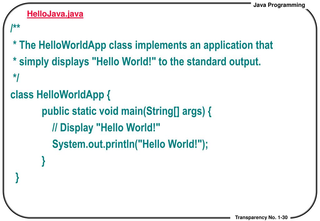 An Example /** * The HelloJava class implements an application that * simply displays "Hello Java!" to the standard output. */ class HelloJava { public static void main(String[] args) { // Display "Hello Java!" System.out.println("Hello Java!"); } }