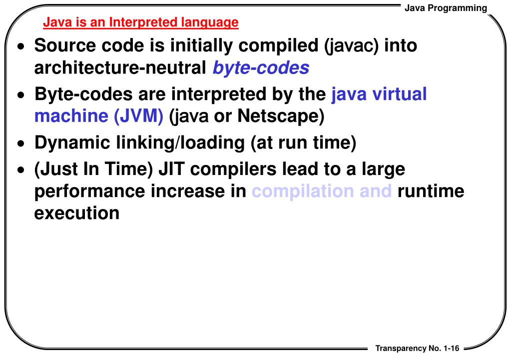 Java is an Interpreted language • Source code is initially compiled (javac) into architecture-neutral byte-codes • Byte-codes are interpreted by the java virtual machine (JVM) (java or Netscape) • Dynamic linking/loading (at run time) • (Just In Time) JIT compilers lead to a large performance increase in compilation and runtime execution