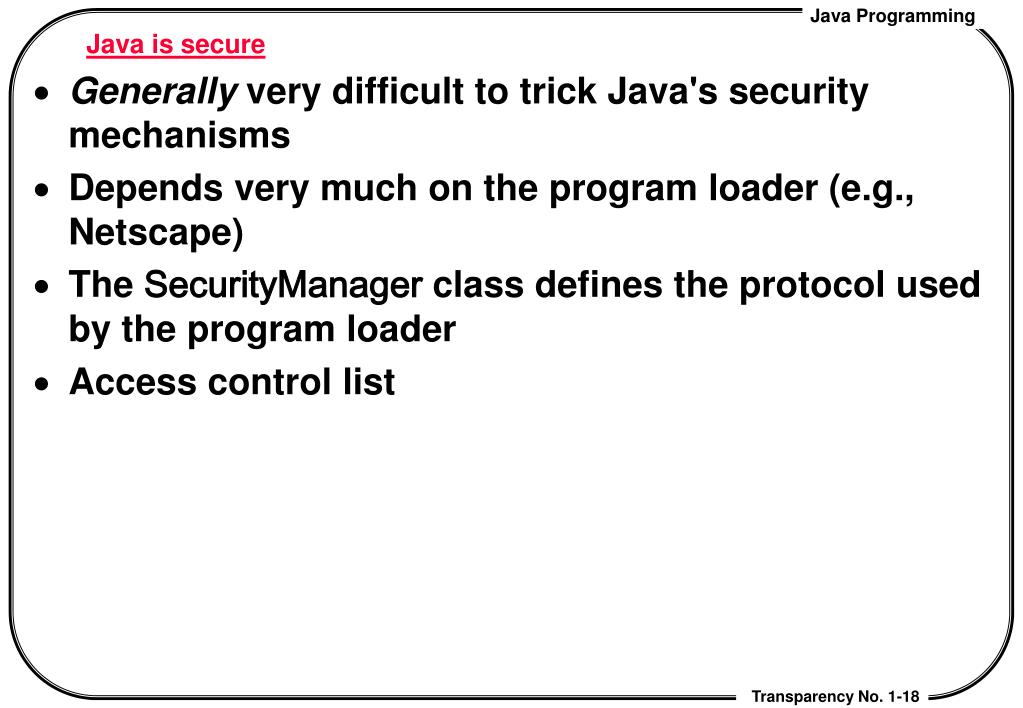 Java is secure • Generally very difficult to trick Java's security mechanisms • Depends very much on the program loader (e.g., Netscape) • The SecurityManager class defines the protocol used by the program loader • Access control list