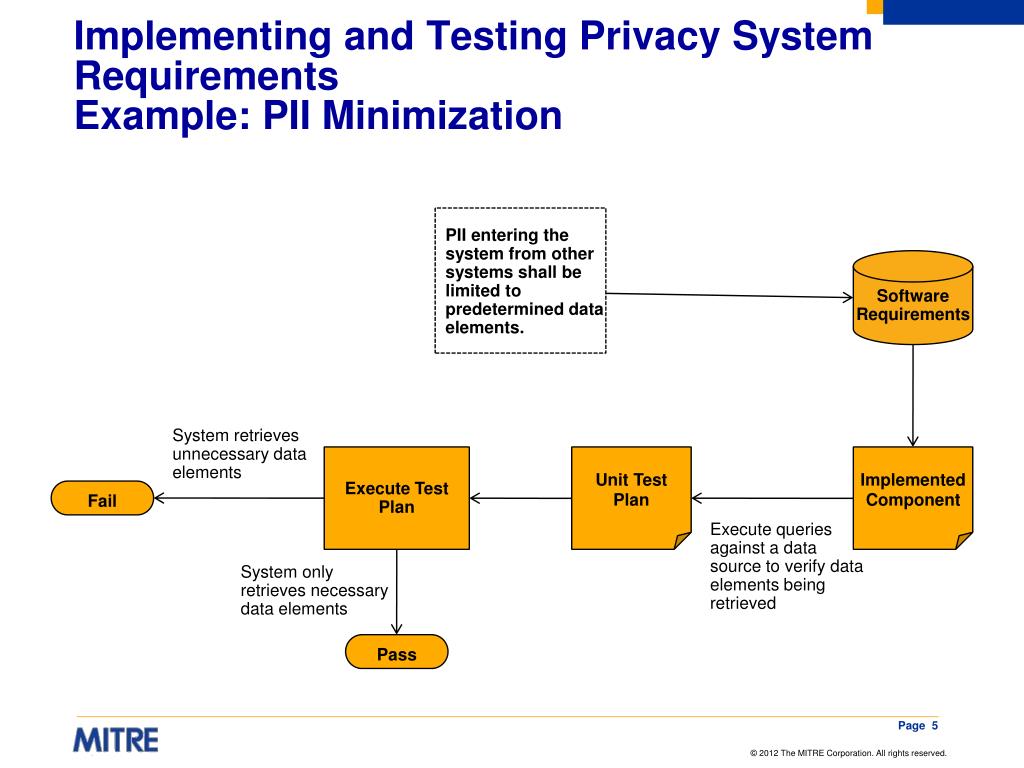 Implementing and Testing Privacy System RequirementsExample: PII Minimization PII entering the system from other systems shall be limited to predetermined data elements. Software Requirements System retrieves unnecessary data elements Execute Test Plan Unit Test Plan Implemented Component Fail Execute queries against a data source to verify data elements being retrieved System only retrieves necessary data elements Pass
