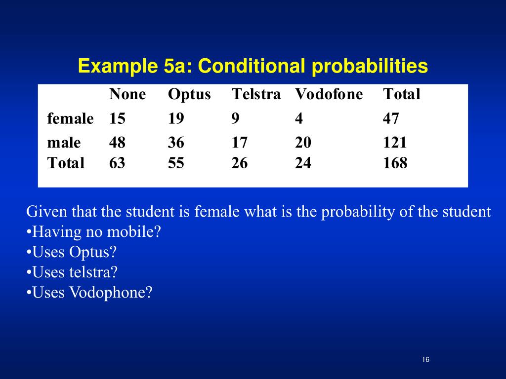 Example 5a: Conditional probabilities • Given that the student is female what is the probability of the student • Having no mobile? • Uses Optus? • Uses telstra? • Uses Vodophone? P(No mobile|female) = 15/47 P(Optus|female) = 19/47 P(Telstra|female) = 9/47 P(Vodo|female)= 4/47