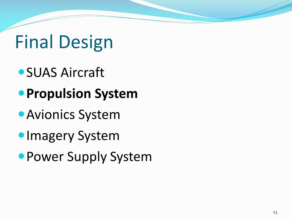 Final Design • SUAS Aircraft • Propulsion System • Avionics System • Imagery System • Power Supply System