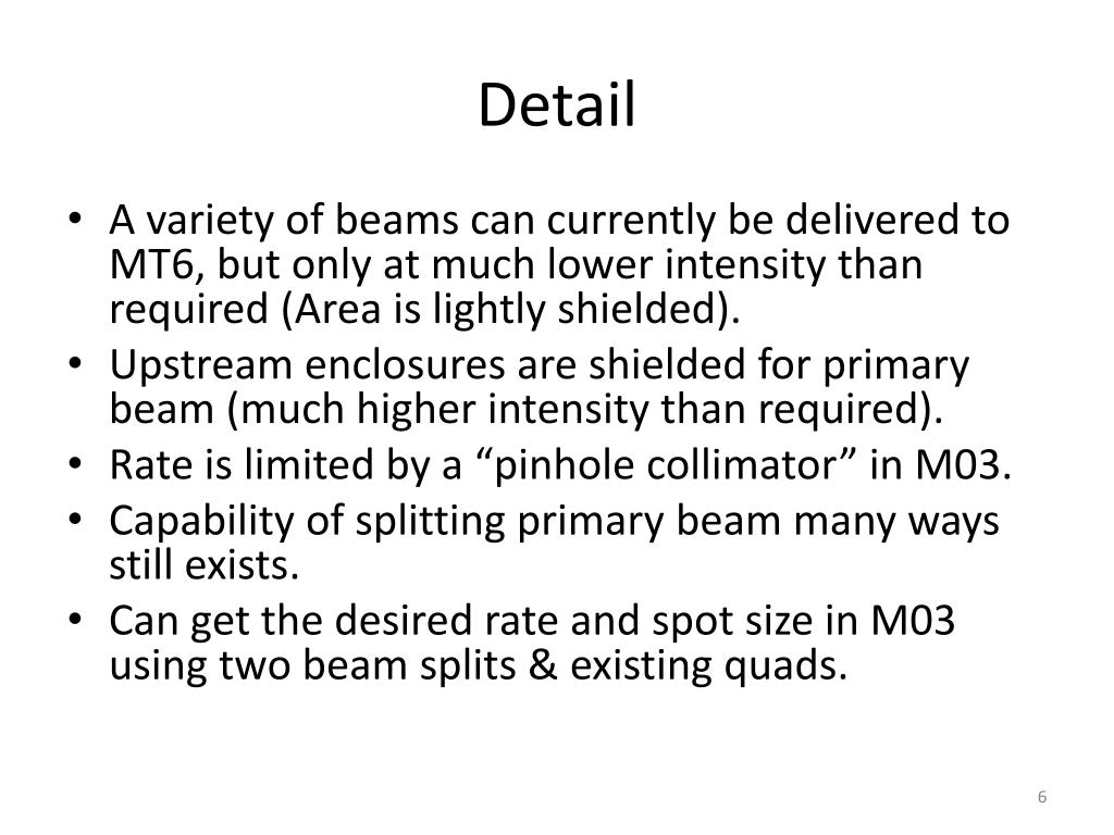 Detail • A variety of beams can currently be delivered to MT6, but only at much lower intensity than required (Area is lightly shielded). • Upstream enclosures are shielded for primary beam (much higher intensity than required). • Rate is limited by a “pinhole collimator” in M03. • Capability of splitting primary beam many ways still exists. • Can get the desired rate and spot size in M03 using two beam splits & existing quads.