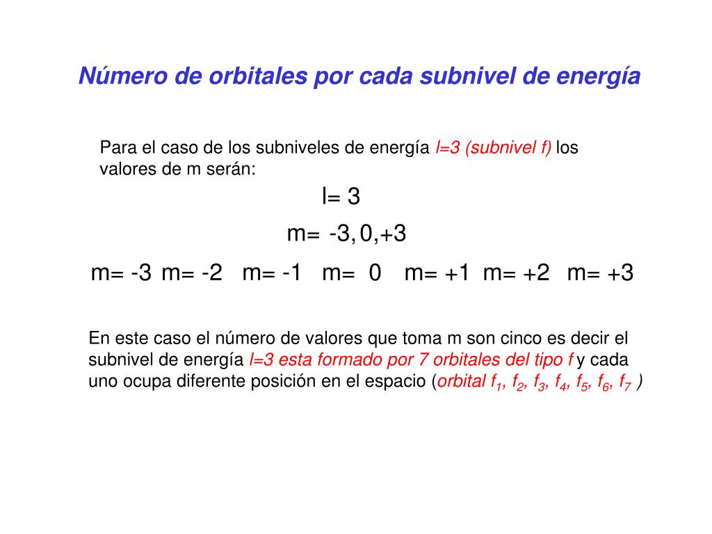 Número de orbitales por cada subnivel de energía Para el caso de los subniveles de energía l=3 (subnivel f) los valores de m serán: l= 3 m= -3, 0, +3 m= -1 m= -2 m= 0 m= +1 m= +2 m= -3 m= +3 En este caso el número de valores que toma m son cinco es decir el subnivel de energía l=3 esta formado por 7 orbitales del tipo f y cada uno ocupa diferente posición en el espacio (orbital f1, f2, f3, f4, f5, f6, f7 )