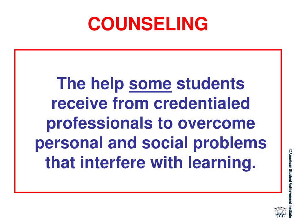 COUNSELING • The help some students receive from credentialed professionals to overcome personal and social problems that interfere with learning.