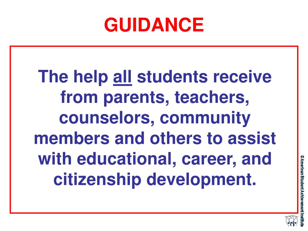 GUIDANCE The help all students receive from parents, teachers, counselors, community members and others to assist with educational, career, and citizenship development.